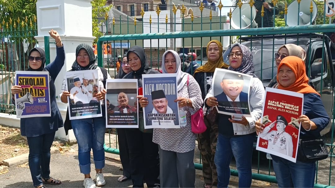 kalangan emak-emak dan aktivis tampak memberikan dukungan kepada mantan Gubernur Sumatera Selatan, Alex Noerdin, usai menjalani sidang perdana dalam perkara dugaan korupsi proyek Kerja Sama Mitra Bangun Guna Serah (BGS) pemanfaatan aset tanah Pemprov Sums-Heru-PALTV