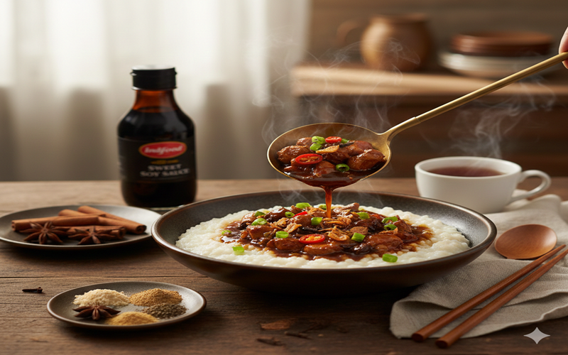Disajikan dengan kuah kecap manis yang harum dan rempah pekat, bubur ini memiliki rasa yang hangat, lembut, dan sangat comfort food.