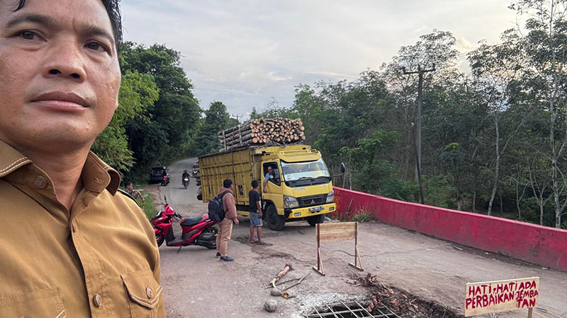 Kepala Desa Tebedak Satu Zuhriyadi berswafoto dengan latar belakang kondisi kerusakan jembatan.--Dokumentasi Kepala Desa Tebedak Satu