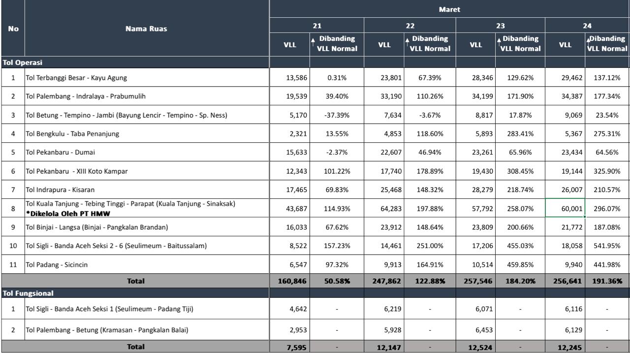 Peningkatan ini merupakan bagian dari lonjakan arus balik Lebaran 2026 di Jalan Tol Trans Sumatera (JTTS). Secara keseluruhan, total trafik harian di ruas tol yang telah beroperasi mencapai 256.641 kendaraan atau meningkat 191,36 persen dibandingkan hari biasa.