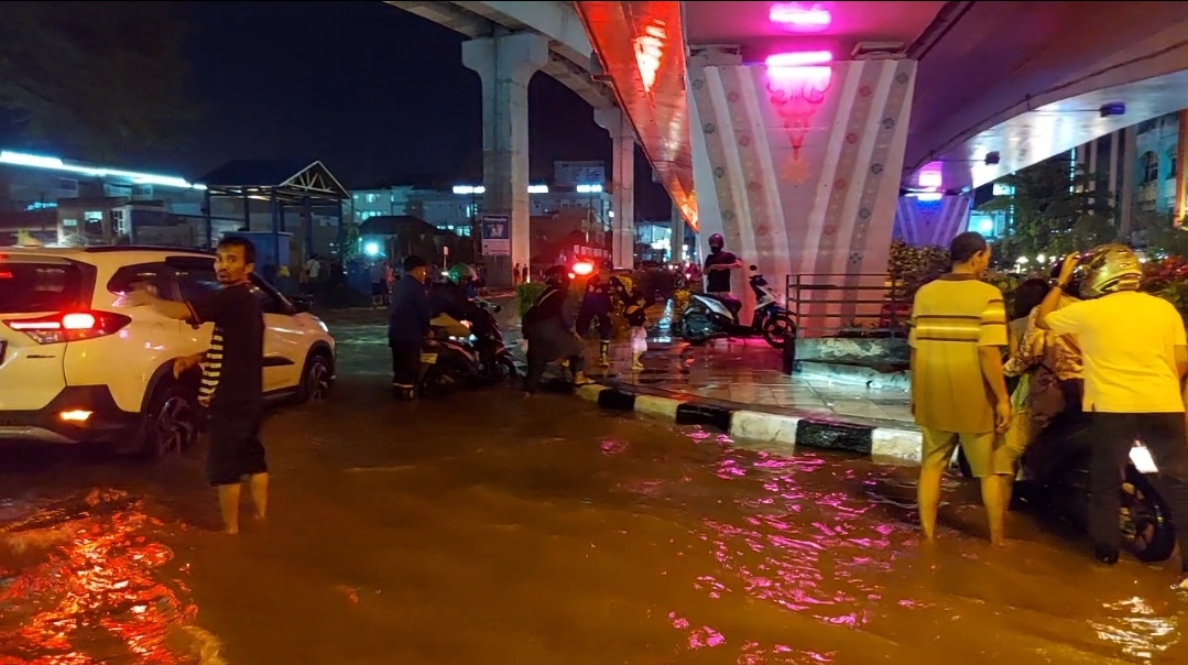Salah satu lokasi yang terpantau mengalami genangan cukup parah adalah di kawasan Simpang Empat Polda Sumsel, tepatnya di bawah jembatan flyover.