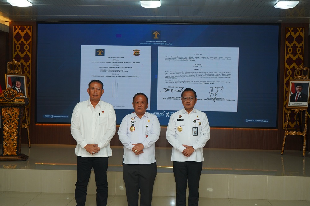 Penandatanganan dilakukan oleh Direktur Reserse Kriminal Umum Polda Sumatera Selatan Kombes Pol Johannes Bangun dan Kepala Divisi Pelayanan Hukum Kanwil Kemenkum Sumsel Alkana Yudha, serta disaksikan langsung oleh Kepala Kantor Wilayah Kementerian Hukum Sumatera Selatan.