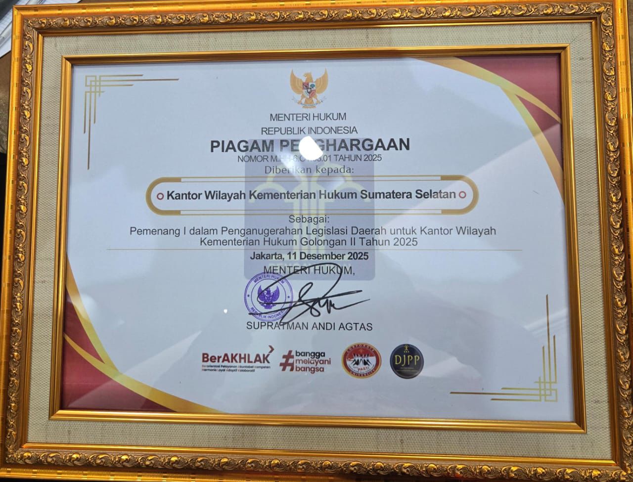 PALTV.CO.ID- Kantor Wilayah Kementerian Hukum Sumatera Selatan kembali menorehkan prestasi membanggakan di tingkat nasional dengan meraih Peringkat Terbaik Pertama Penganugerahan Legislasi Daerah Golongan II Tahun 2025.