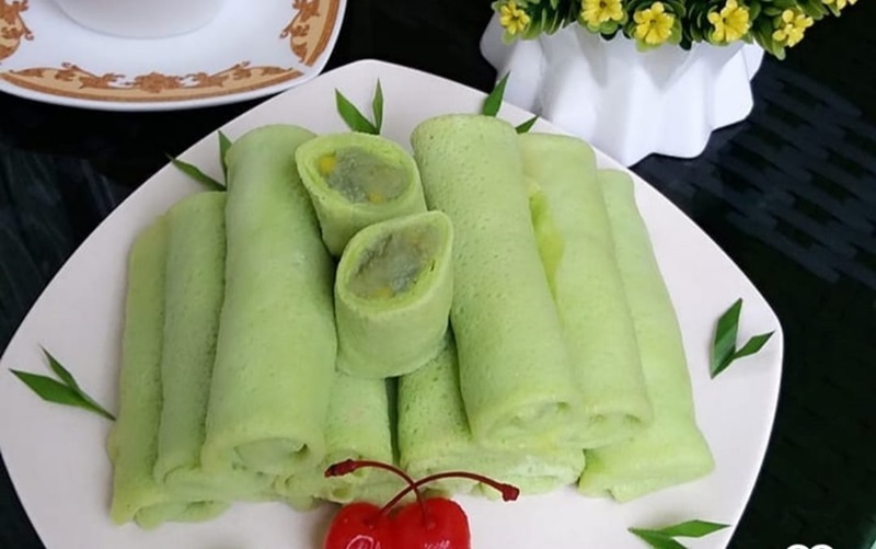 Dadar gulung khas Palembang terbuat dari adonan tepung terigu yang diberi warna hijau alami.