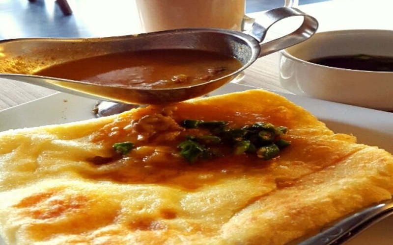 Kombinasi martabak gurih dan kuah kari pekat menjadikan hidangan ini berbeda dari martabak telur di daerah lain.