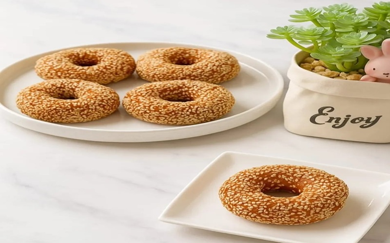Keunikan donat ini semakin menonjol dengan adanya balutan biji wijen putih yang menutupi seluruh permukaannya.