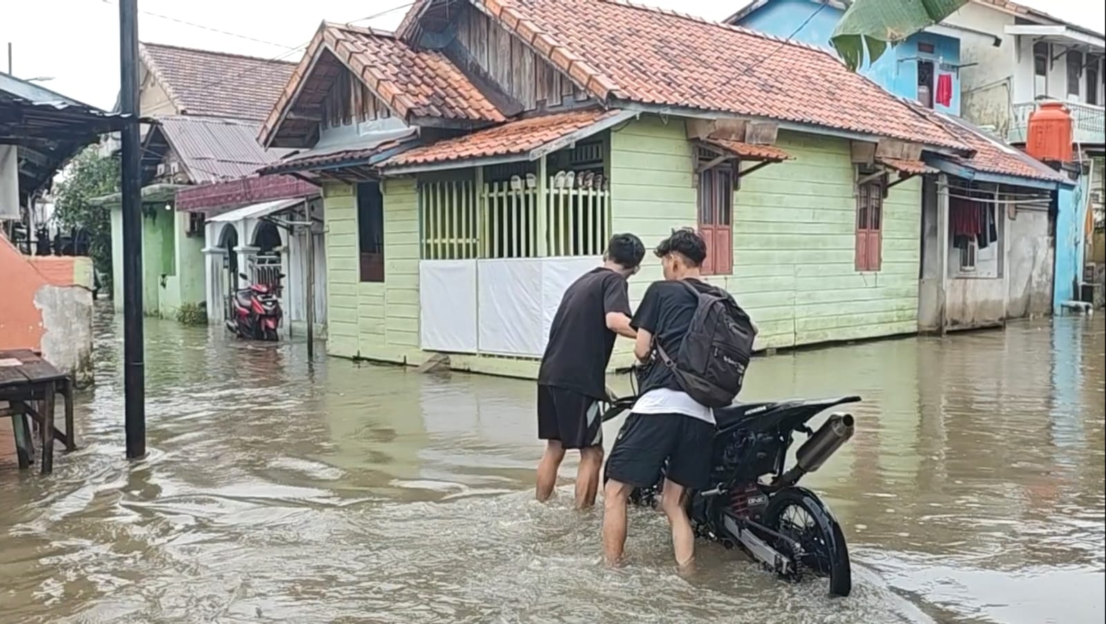 Genangan air setinggi lutut orang dewasa menutupi hampir seluruh badan jalan, mengakibatkan akses kendaraan terhambat. Beberapa sepeda motor warga bahkan mogok saat mencoba melintas di tengah derasnya arus air.