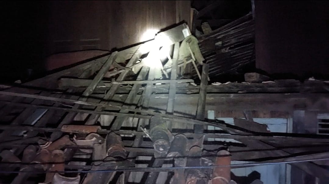 Bagian rumah yang runtuh meliputi atap dan sebagian dinding kayu, membuat puing-puing berjatuhan ke dua mobil yang terparkir di depannya.