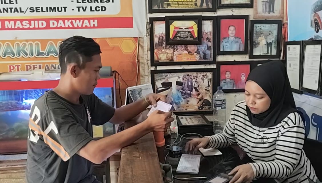 Petugas loket bus Palembang memberikan informasi kondisi jalur kepada calon penumpang.-M. Aidil-PALTV