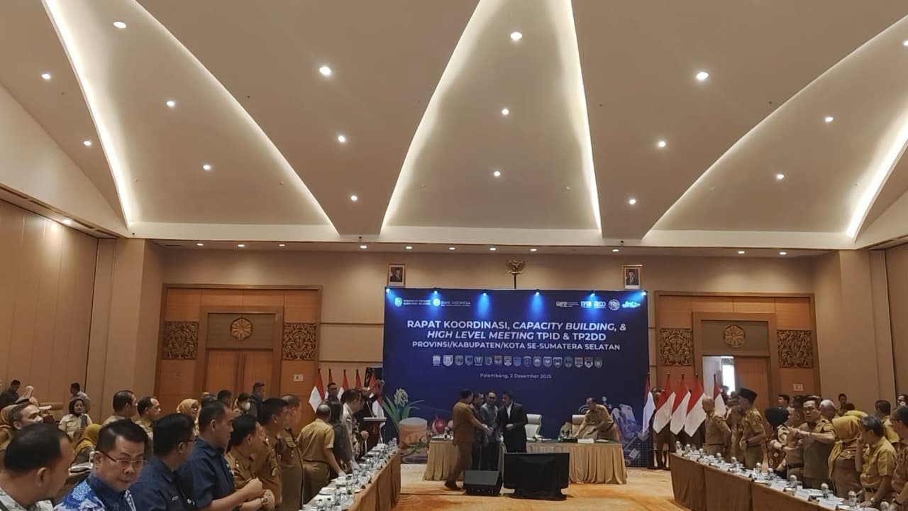 PALEMBANG, PALTV.CO.ID - Rapat Koordinasi TPID dan TP2DD Provinsi/Kabupaten/Kota se-Sumatera Selatan digelar di Ballroom Hotel Aryaduta, Selasa 2 Desember 2025, untuk mengevaluasi kinerja pengendalian inflasi serta mematangkan langkah menghadapi momentum Natal dan Tahun Baru.
