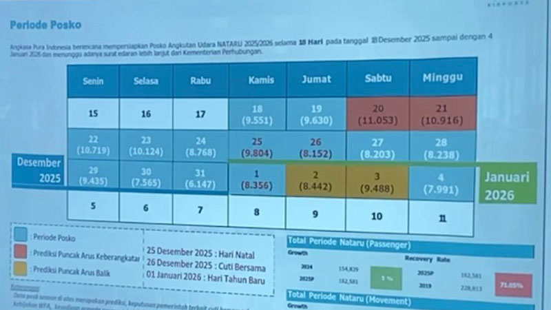 “Kita akan menyiapkan Posko Terpadu selama 18 hari dari 18 Desember 2025, yang terdiri dari semua intansi yang terkait penerbangan, seperti Basarnas, Maskapai, TNI/Polri, termasuk kami sendiri, dan lainnya,” ungkap EGM Angkasa Pura II R Iwan Winaya Mahdar pada hari Kamis, 4 Desember 2025.