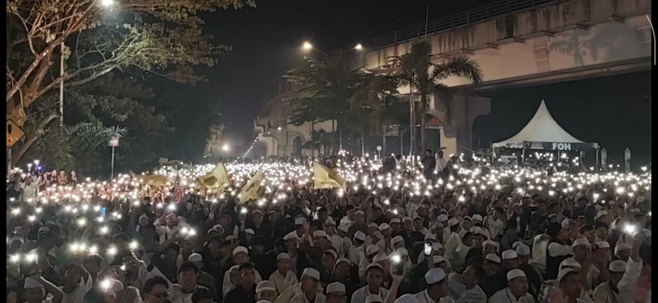 Ribuan warga memadati kawasan Bundaran Jakabaring, Palembang, Jumat malam (12/12/2025), dalam kegiatan Palembang Darussalam bertajuk Mengetuk Langit untuk Sumatera. -M. Aidil-PALTV