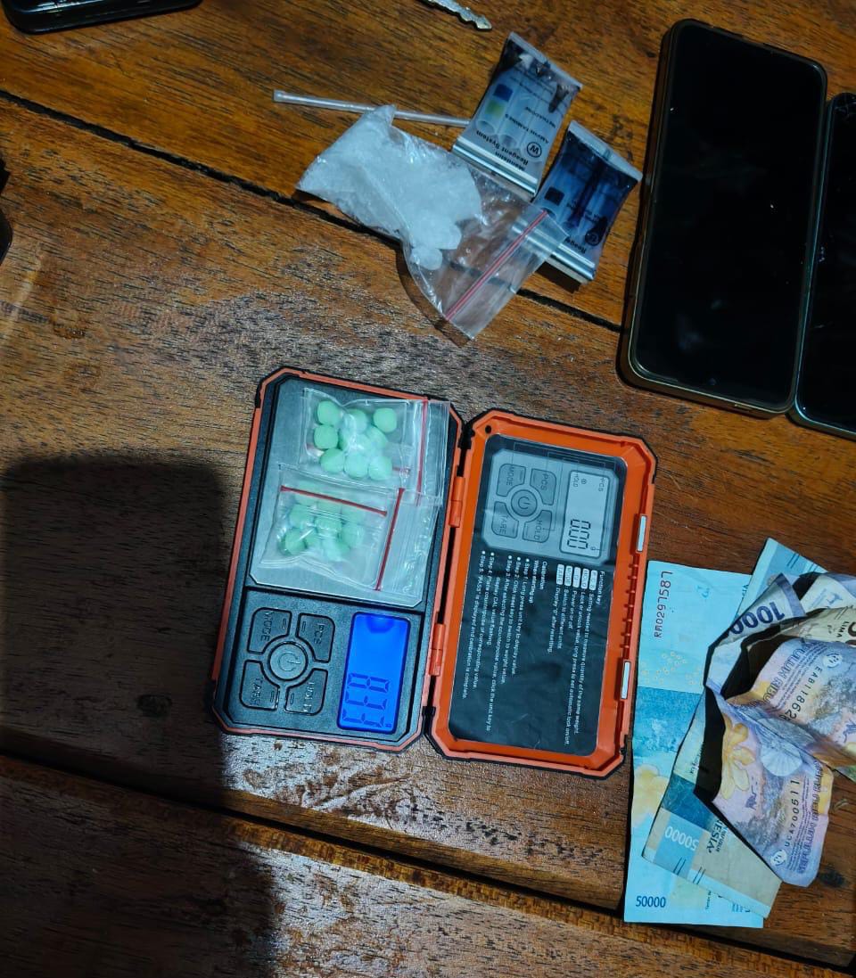 Setelah penangkapan, tim gabungan segera melakukan penggeledahan dan berhasil menyita sejumlah barang bukti krusial, meliputi Sabu-sabu sebanyak 1 kantong paket dengan berat 25,03 gram dan Ekstasi: 20 butir jenis kerang warna hijau.