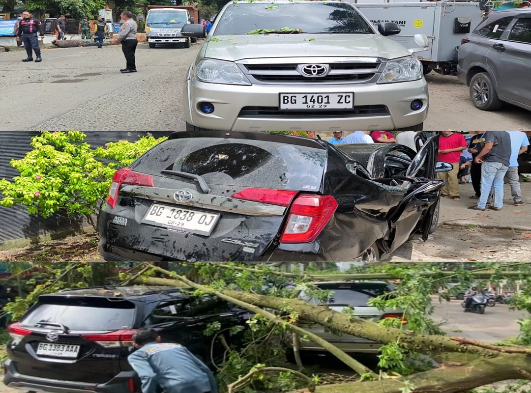 Dari tiga mobil yang tertimpa pohon tua ini, salah satu mobil mengalami rusak berat dan harus dilakukan perbaikan serius.