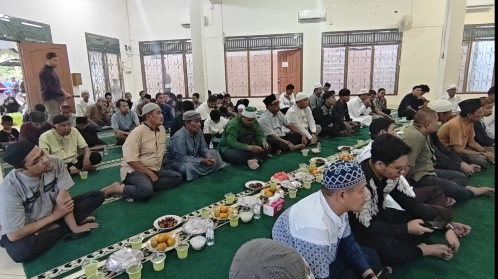 Rangkaian kegiatan diawali dengan tausiah keagamaan, doa bersama, berbuka puasa, serta salat Magrib dan tarawih berjamaah. Suasana kebersamaan tampak hangat dengan kehadiran keluarga dari berbagai generasi.