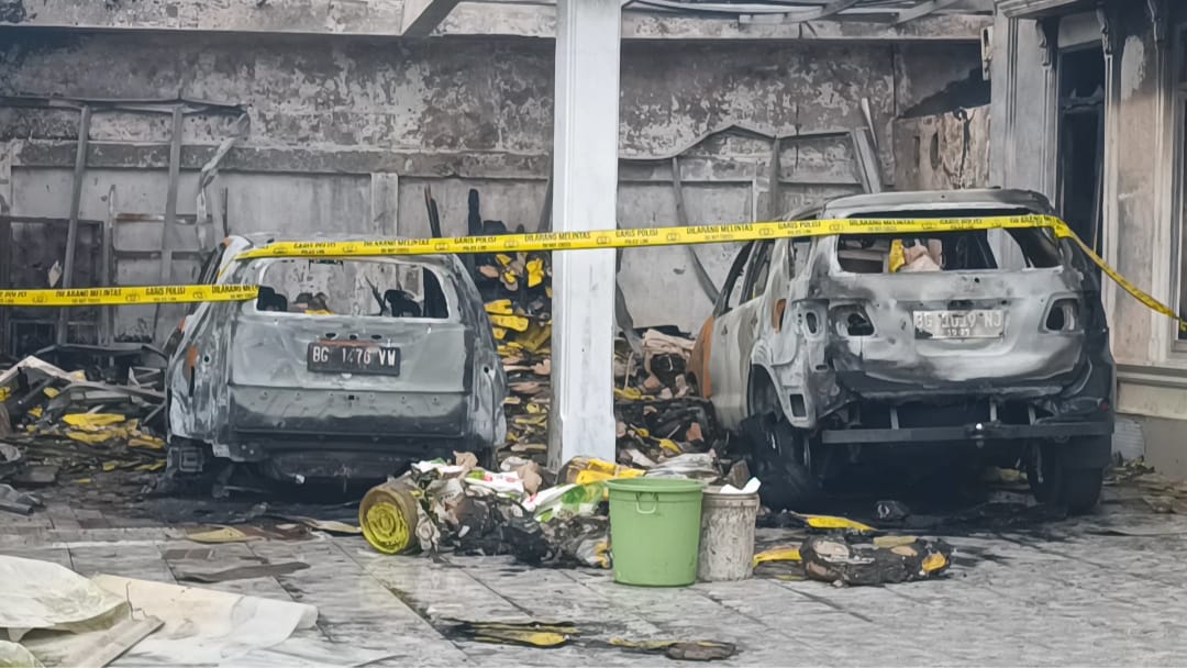 Sejumlah barang yang hangus terbakar masih berada di lokasi, termasuk rangka kendaraan yang tersisa, sebagai bagian dari proses penyelidikan untuk mengungkap penyebab pasti kebakaran. Kondisi garasi terlihat menghitam, sementara sisa-sisa material yang terbakar belum dipindahkan.