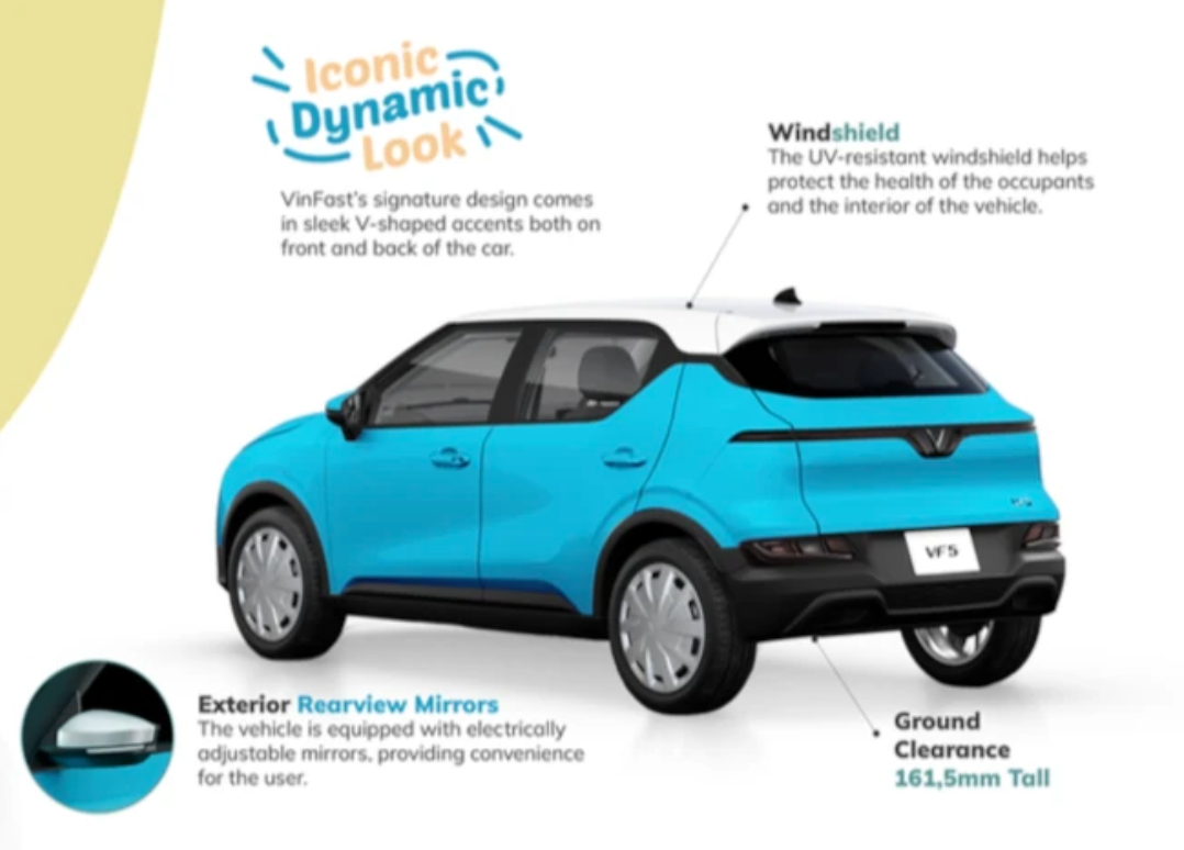 Dari sisi tampilan, VF 5 mengusung desain kompak yang sangat cocok untuk mobilitas perkotaan. Dimensinya yang tidak terlalu besar memudahkan pengemudi bermanuver di jalan sempit maupun saat parkir di area terbatas.
