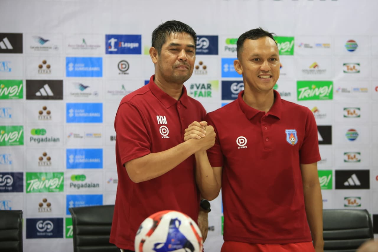 Pelatih Kepala Sumsel United Nilmaizar saat konferensi pers pra pertandingan di Palembang-Ekky-PALTV