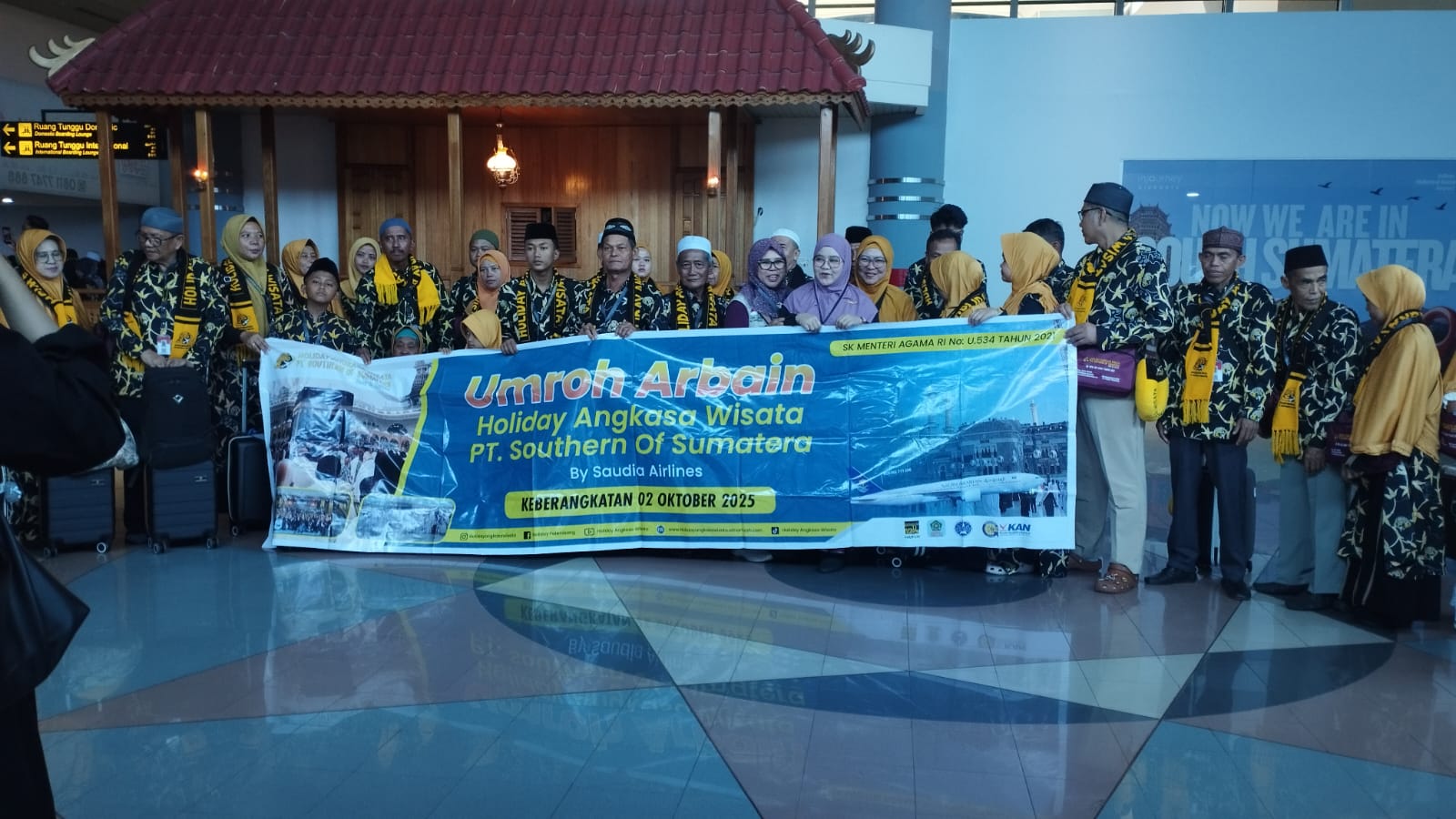 PALTV.CO.ID- Holiday Angkasa Wisata kembali melepas rombongan jemaah umroh Arbain pada Kamis (2/10) pagi di Bandara Internasional Sultan Mahmud Badaruddin II Palembang.