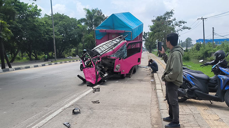 Sebuah truk Isuzu berwarna pink melaju kencang dan menabrak truk kontainer yang mogok di bahu jalan