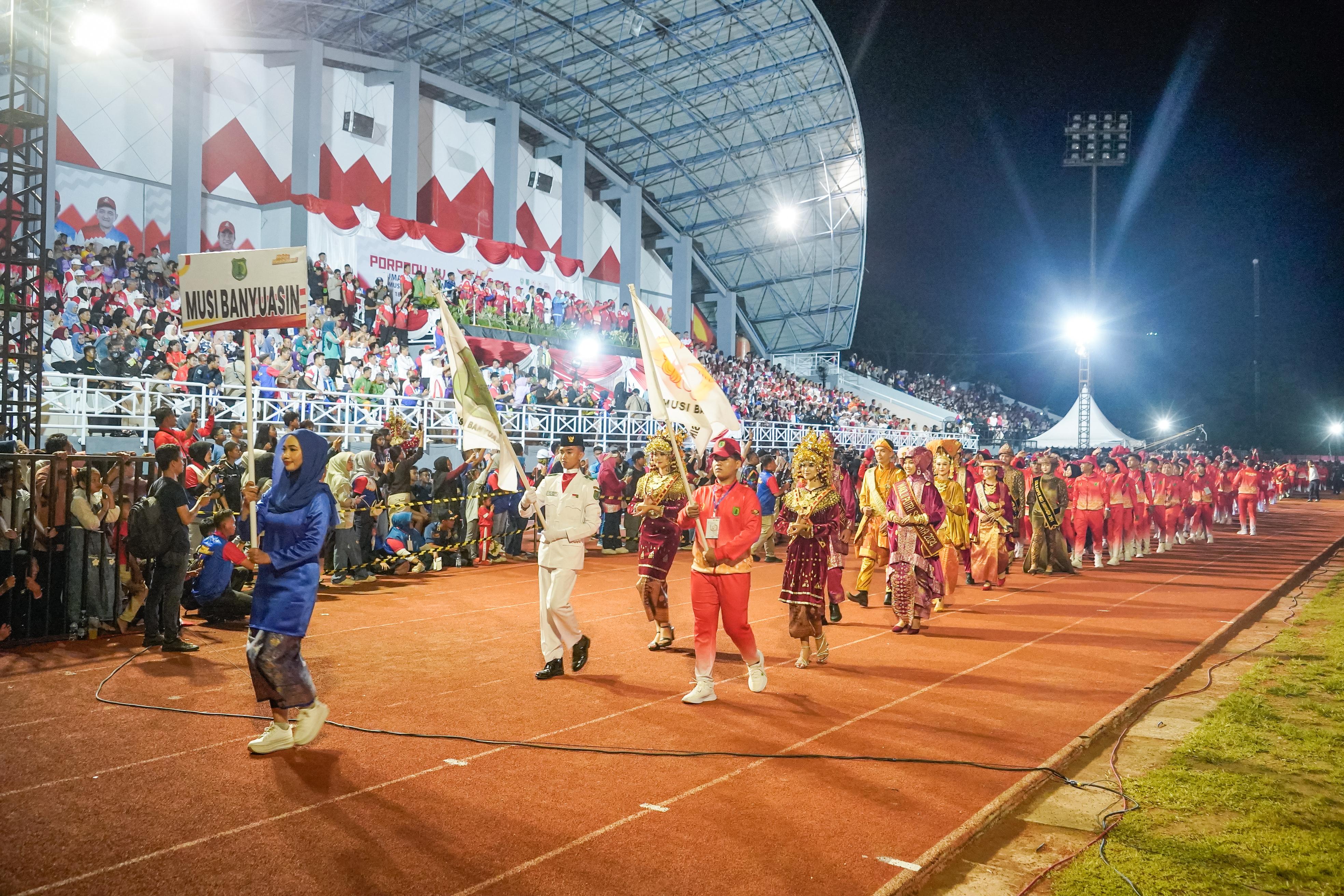 Kemeriahan terasa sejak awal acara. Dentuman musik, parade budaya, hingga pertunjukan cahaya spektakuler memanjakan mata para penonton yang memadati stadion. Namun momen paling dinanti adalah defile ribuan atlet dari 17 kabupaten dan kota se-Sumatera Selatan, yang dengan bangga melangkah membawa bendera daerah masing-masing — menandai awal perjuangan panjang untuk meraih prestasi tertinggi.