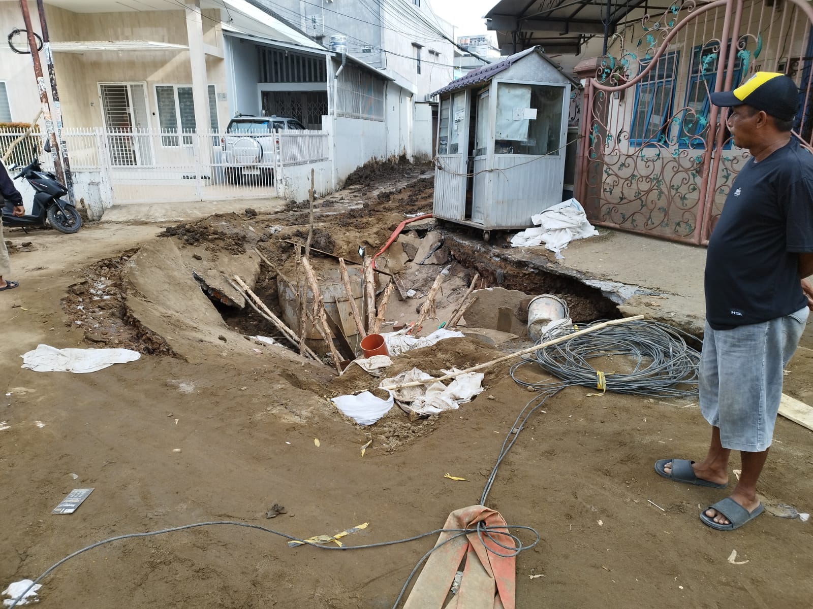 “Awalnya penggalian dilakukan tanggal 13 Oktober. Tapi pada Sabtu dini hari tanahnya amblas, mungkin karena timbunan tidak padat dan ada aliran air di bawah. Sejak pagi jalan langsung rusak parah, warga RT 19 tidak bisa lewat pakai kendaraan dan hanya bisa jalan kaki,” ujar Johan.