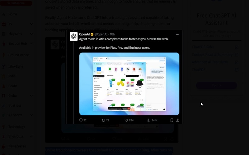 Pembuat ChatGPT secara resmi meluncurkan ChatGPT Atlas, peramban web bertenaga AI pertamanya,--ig@indian today
