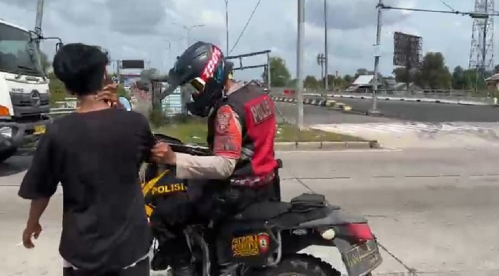 Pria yang melakukan pemalakan terhadap sopir truk di simpang empat lampu merah exit Tol Kramasan arah Lampung berhasil ditangkap polisi, Rabu (15/10/2025).-Ahmad Romawi-PALTV