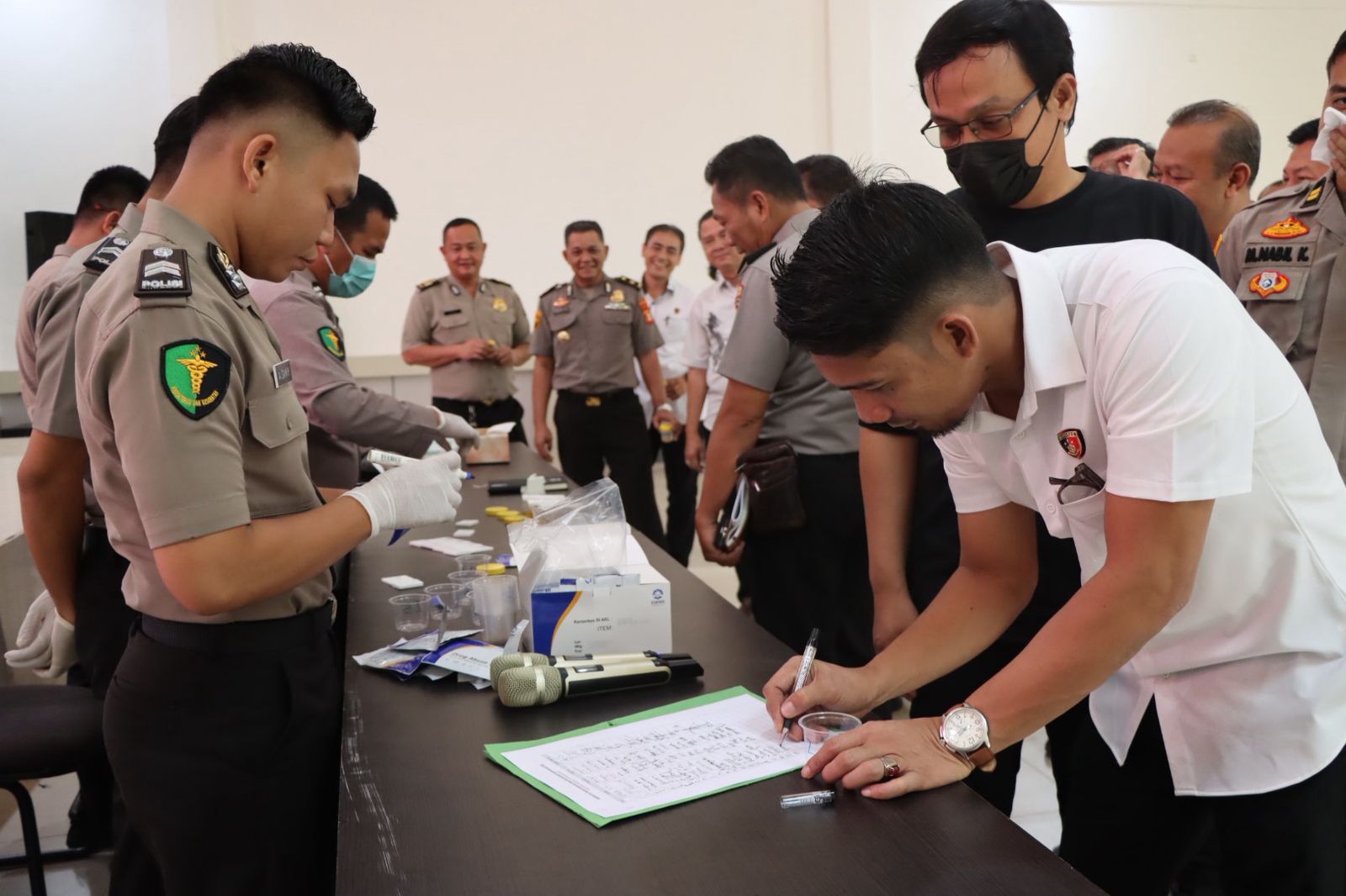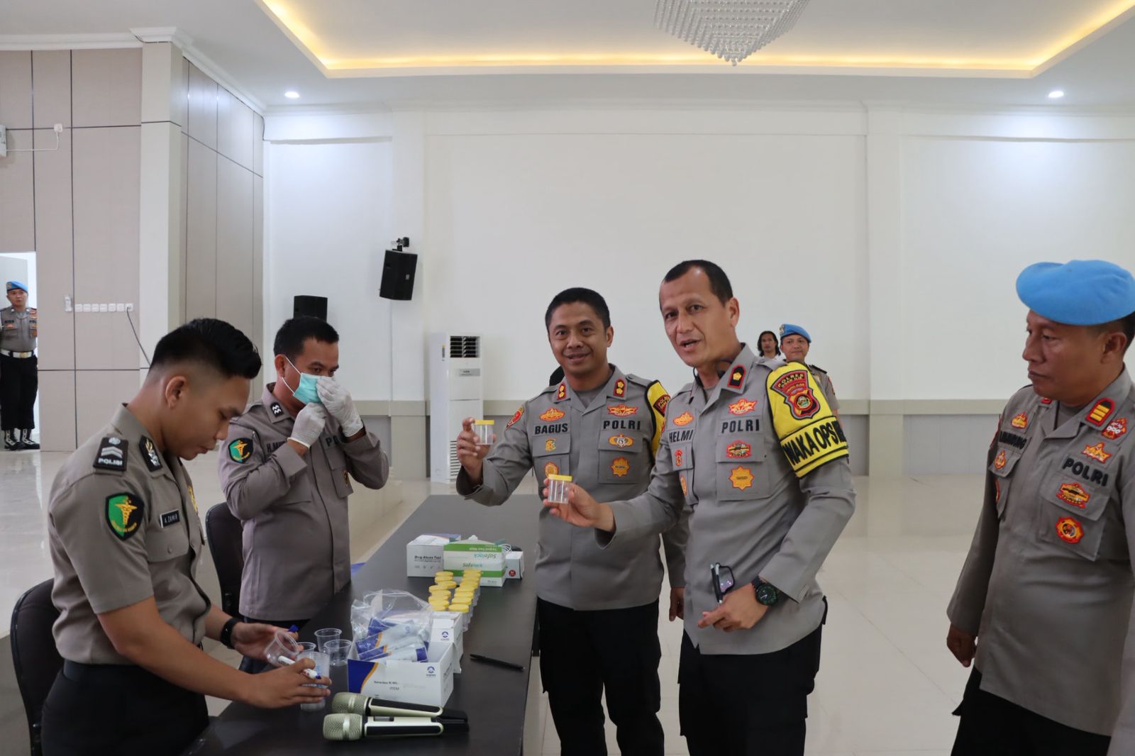 Kapolres Ogan Ilir memimpin tes urine di Aula Panaluan II--Foto : Humas Polres Ogan Ilir