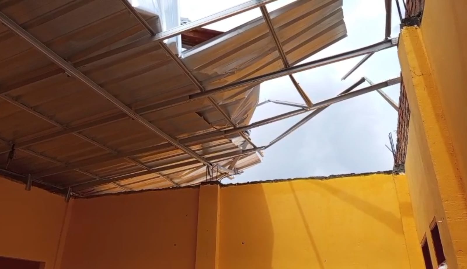 Angin kencang yang berputar menyebabkan atap seng gedung lantai 2 beterbangan, plafon kelas ambruk serta batu bata berjatuhan.