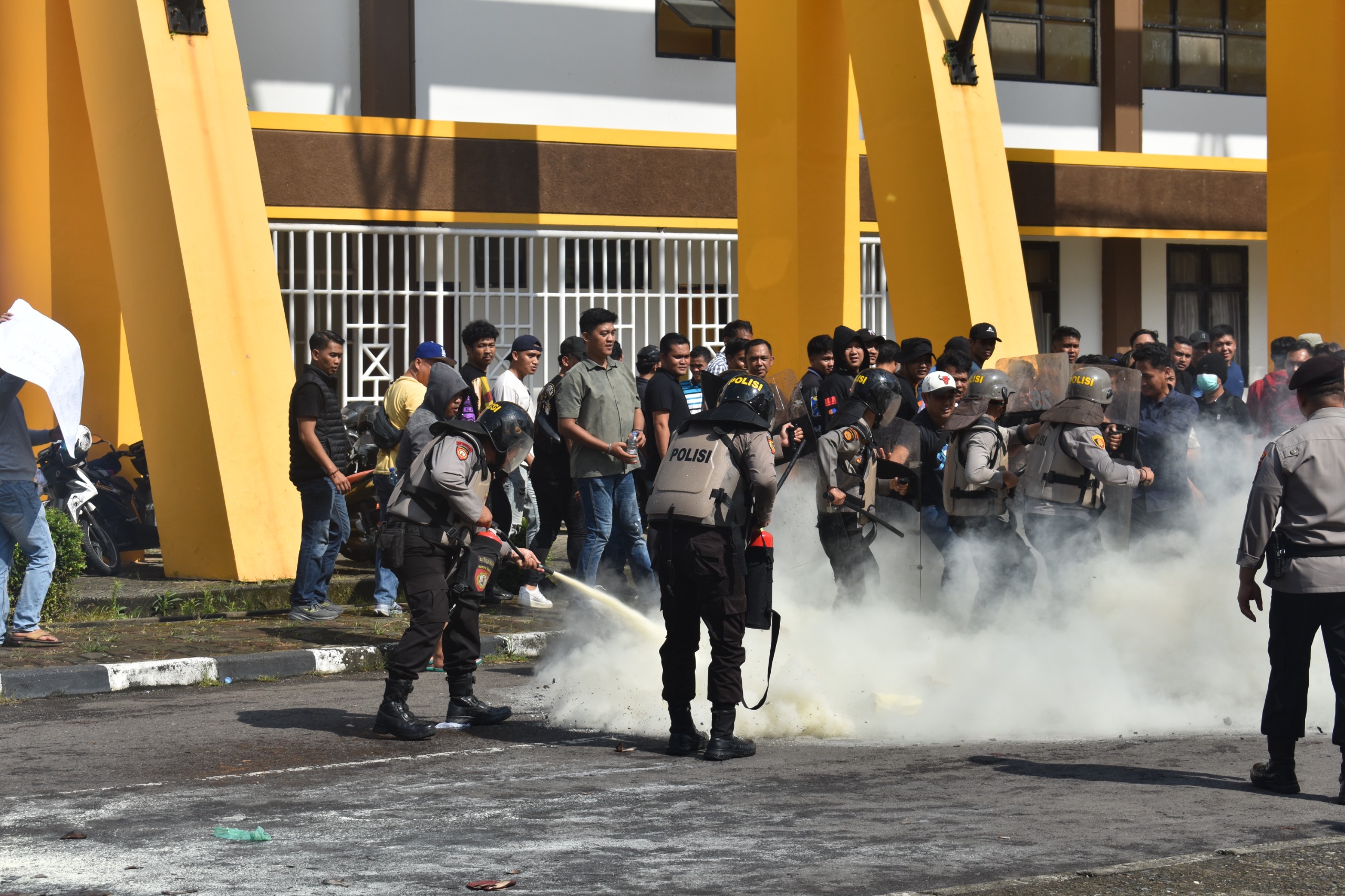 Situasi bentrok antara pihak kepolisian Polres Muara Enim dengan massa aksi saat gelaran simulasi Sispamkota. --Foto ; Mardiansyah - PALTV