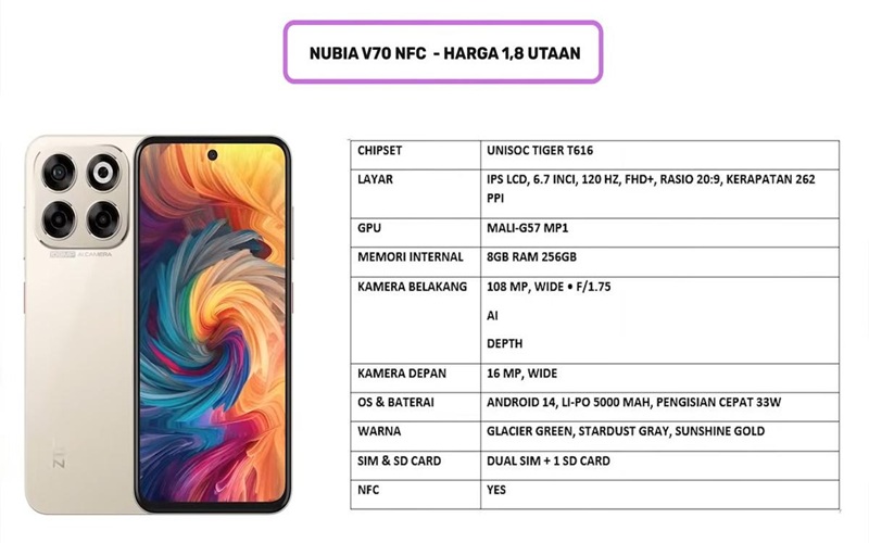 Loncatan teknologi paling signifikan terlihat pada Nubia V70 NFC yang berani menyematkan kamera utama beresolusi 108 megapiksel.